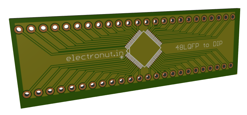 I have been looking at prototyping with some ARM Cortex M4 chips, and many of them use a 48 pin LQFP packaging. Sadly, I haven't been able to find a decent 48 LQFP to DIP adapter PCB in India. The only one I saw was expensive and designed in a crazy way (4 sets of orthogonal pins) which made it useless for breadboard prototyping. So I decide to create one of my own.