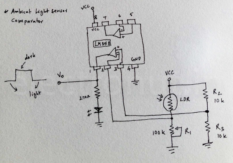 In the above circuit, the reference voltage at the non-inverting terminal of the op-amp is VCC/2. When it's dark, the LDR has a high resistance (over 20K), and the voltage at the inverting terminal (pin 3) is going to be less than VCC/2. Hence, the output of the op-amp will go to high when it is dark. When sufficient light falls on the LDR, its resistance falls, and the voltage at the inverting terminal (pin 2) exceeds VCC/2. At this point, the op-amp output goes low. We can control the threshold at which it goes from low to high by adjusting the potentiometer R1.
