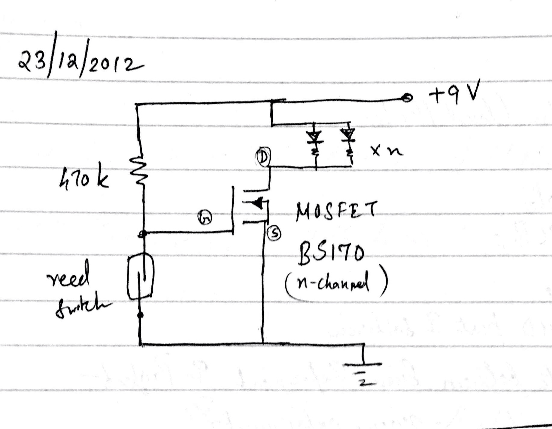 This is a small project that I worked on last year. I have a desk made of dark wood, and it was very difficult to see what was inside the bottom draw. I put together a simple circuit with the schematic below - something which lit up a few strips of LEDs using a magnet stuck to the side of the door to switch a transistor on/off.