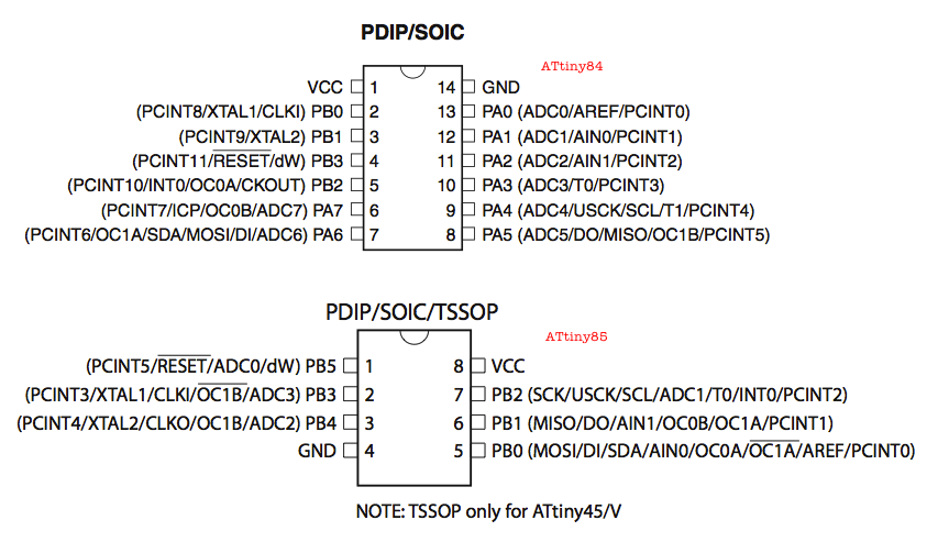 In this post, I'll be setting up to program an Atmel ATtiny84, a chip that I will be using for most of my ATtiny projects. I picked this 14-pin chip rather than the very popular 8-pin ATtiny85 because the former has a few more I/O pins which could come in handy for many projects. Here is a pin comparison between these 2 chips.