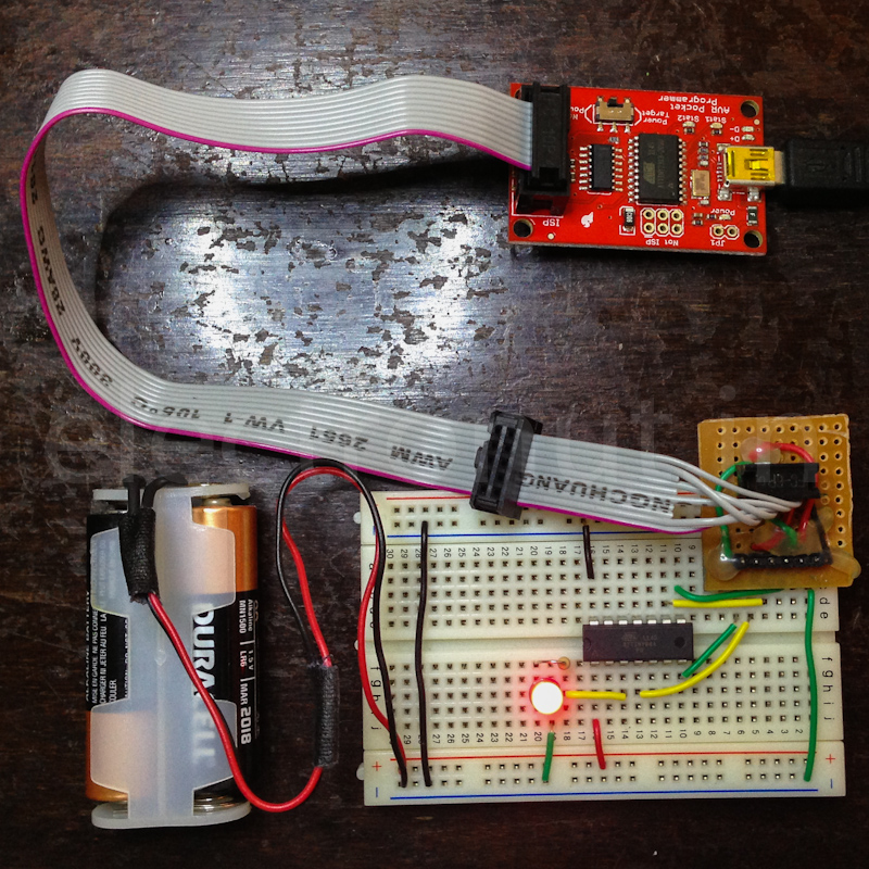 Note that you need not connect the VCC pin to the programmer, if you are powering the circuit yourself. There is a small switch on the programmer in case you decide to go that route.