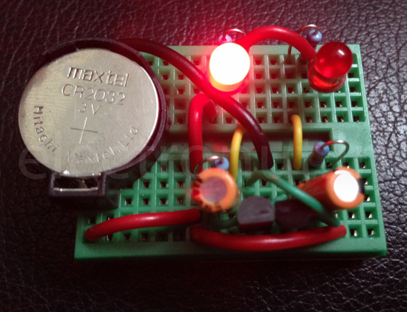 For supply, I used a 3V CR 2032 coin cell. The transistors are 2N2222, but I think any NPN transistor would work in this case. The LEDs are Red, which have low turn-on voltage, and this is important, since we're using a coin cell here. The circuit was assembled on a breadboard.