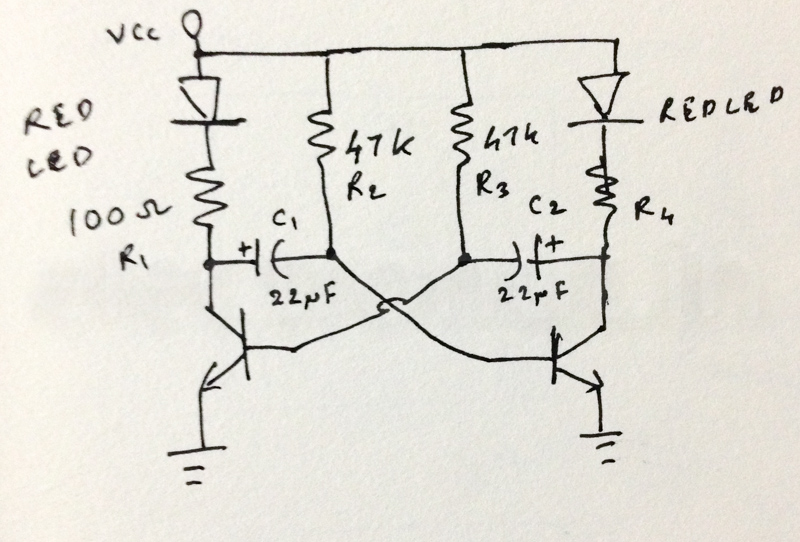 Here is the circuit. It's a two transistor astable multivibrator. (Read the wikipedia link for the gory details of how it works. ;-) )
