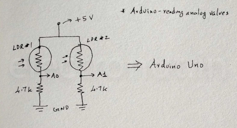 In this post, I will be reading and displaying analog data from a pair of LDRs connected to an Arduino. Here is the schematic: