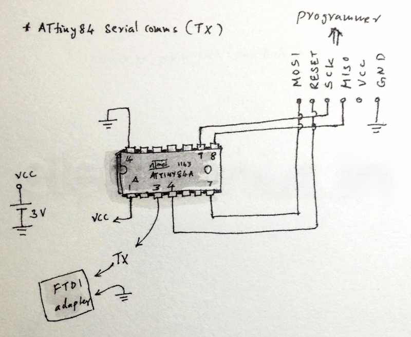 So, now that we have some idea about serial communications, let's talk about implementing a transmit only (TX) for the ATtiny84. Here is our scheme:
