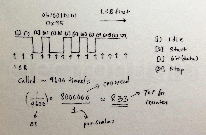 So how do we implement sending a bit every 1/9600 seconds? For this, we use the 16-bit timer (Timer1) of the Attiny84 in CTC mode. The value for the top of the counter is calculated as shown in the image above.